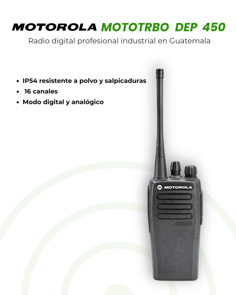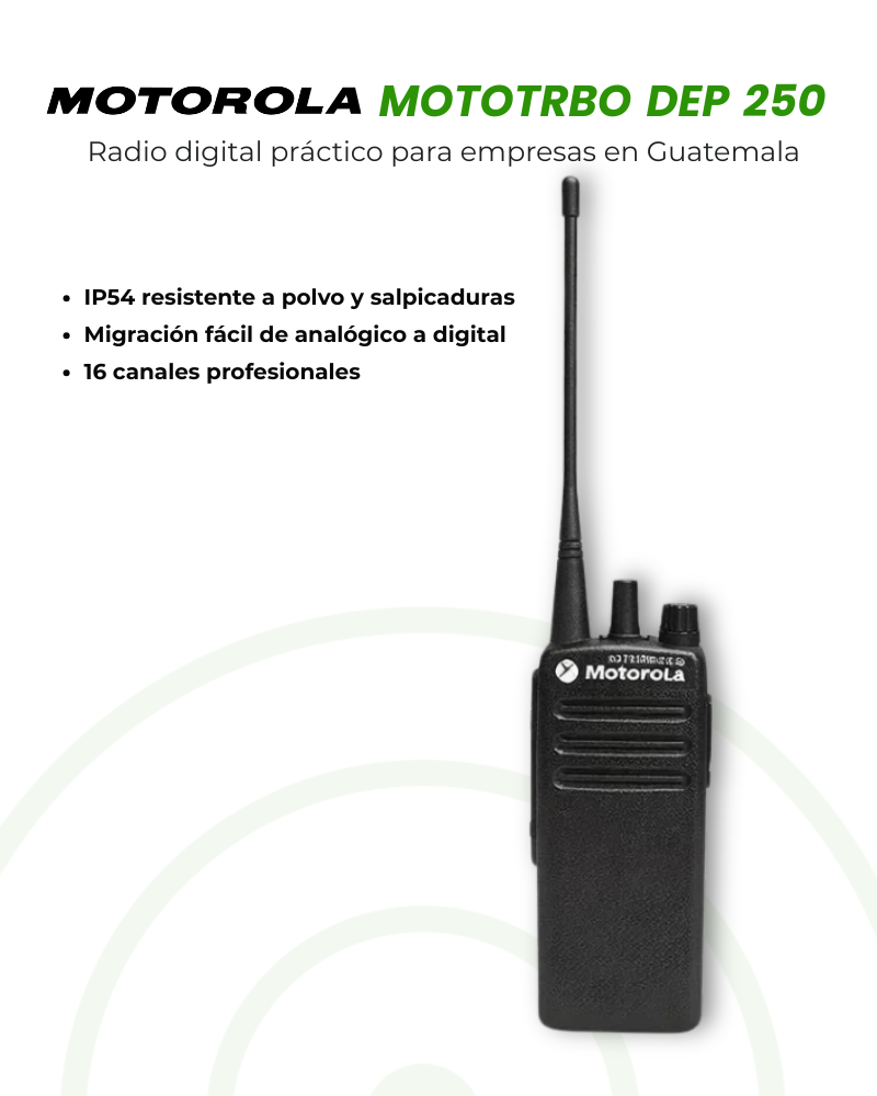 Radio digital práctico y fácil de usar, ideal para hotelería y eventos en Guatemala. Opera en modo analógico y digital, con 16 canales e IP54 resistente a polvo y salpicaduras.